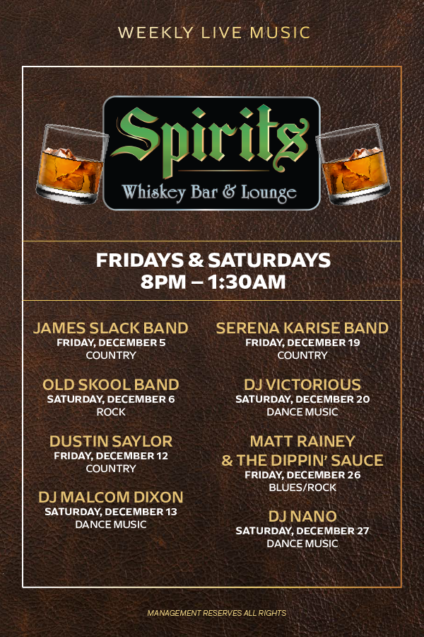 Enjoy a variety of entertainment, all from the same seat! Let our knowledgeable, fun bar staff help you choose that perfect drink. Don’t forget to ask about our specialty: delicious Whiskey creations. We offer a verity of over 50 different Whiskeys to choose from. Cheer for the home team on multiple wide-screen TVs. Enjoy FREE first-class live entertainment every Thursday, Friday, and Saturday and dance the night away! “There’s always something great happening in the Spirits Whiskey Bar & Lounge.”
