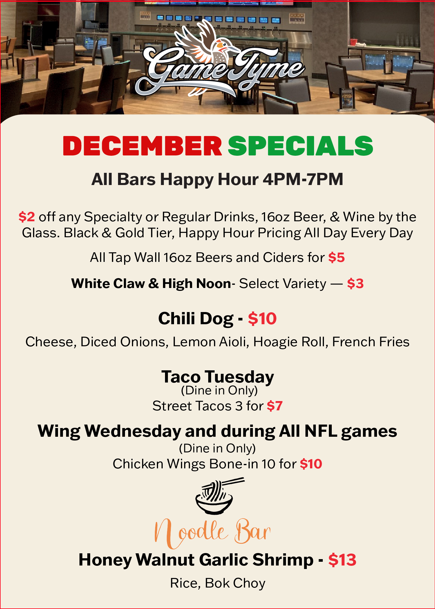 Welcome to the opening of our new restaurant at the GCCR! Head into Game Tyme and ask about our Noodle Bar and enjoy our variety of Asian food such as the Udon Noodles, Wonton Soup, Pho, and much more!